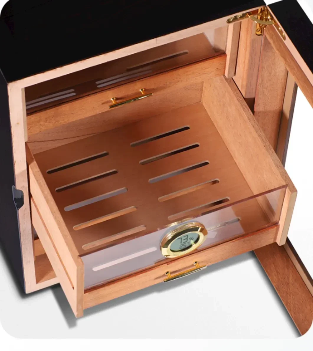Humidorkabinet met 3 lades: Perfect voor de serieuze sigarenliefhebber. Ons Humidor Kabinet is ruim genoeg om een grote hoeveelheid sigaren te bewaren. Of je nu een enthousiaste roker bent of een sigarencollectie wilt starten, dit kabinet biedt voldoende opslagruimte voor al je kostbare sigaren.