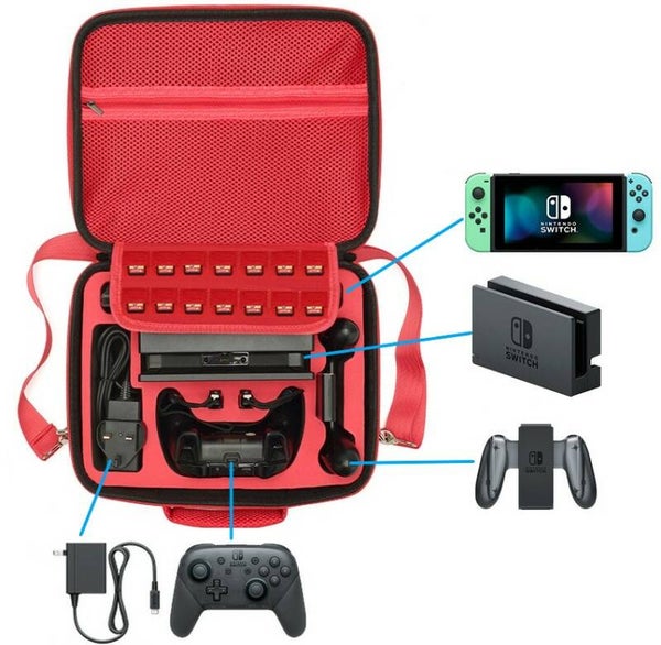 Deze stevige en veilige opberghoes is speciaal ontwikkeld voor de Nintendo Switch, de binnenkant is van EVA schuim gemaakt wat ervoor zorgt dat alles er optimaal in past. Deze case biedt niet alleen ruimte voor de Switch console, maar ook voor je docking station, AC adapter, kabels en de Joy-Con grip of Pro controller. Met de rits sluit je ‘m makkelijk en snel af en voorkom je dat er stof of ander vuil bijkomt. Naast opbergvakken voor 21 game cartridges of SD kaarten is er ook speciaal ruimte gemaakt voor je oordopjes en andere kleine accessoires, ideaal toch?.