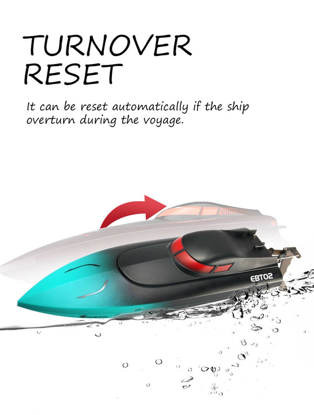Zodra het boot op het water kapseist, kan deze met automatisch 180 ° flip funciton weer recht op het water krijgen. Deze functie controleren en zorgen voor een correcte vaarervaring. De Eachine EBT02 heeft een snelheid tot wel 25 km/u, en is hierdoor 3 keer sneller dan andere gewone RC boten!